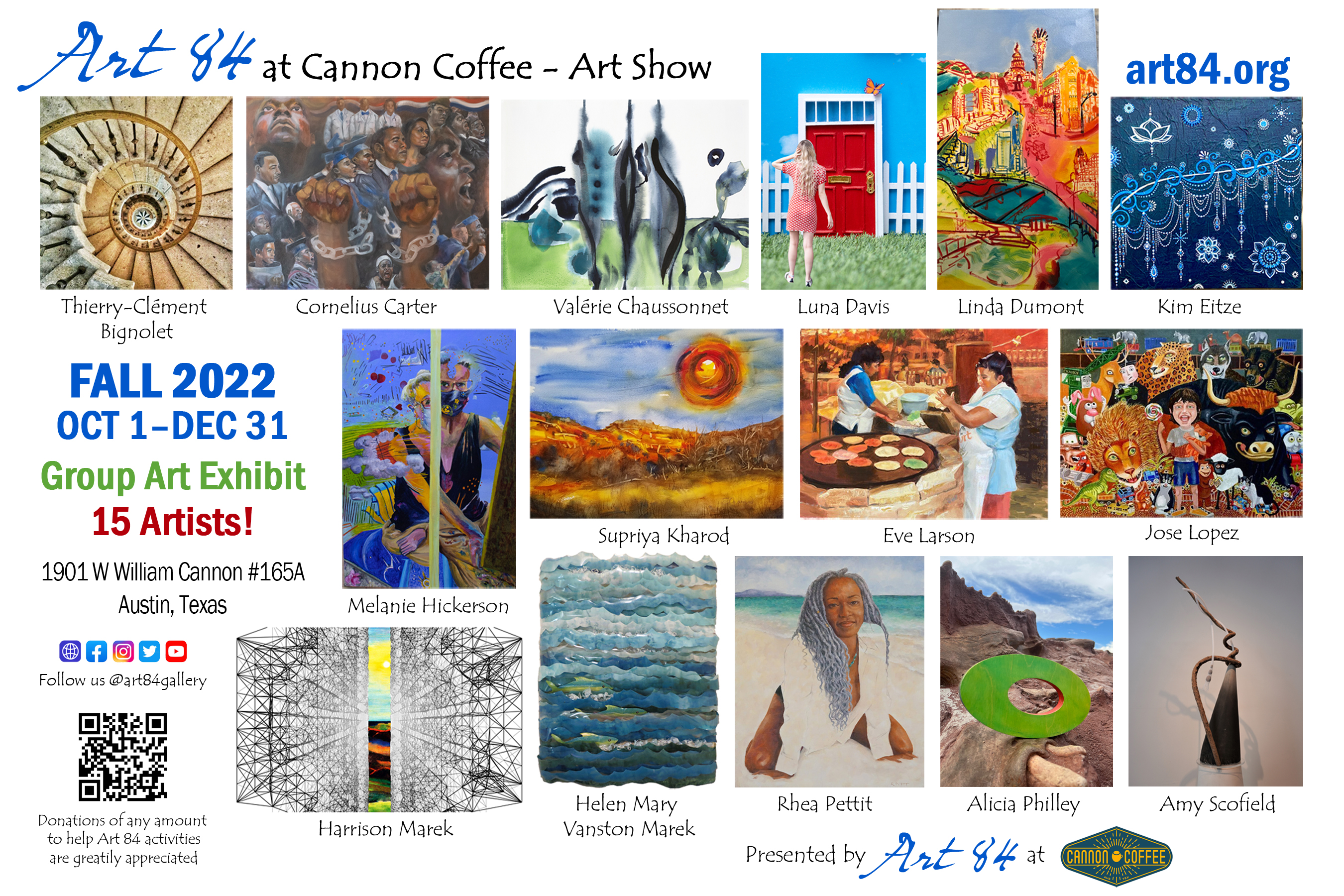Art 84 presents an inspiring collection of art by some of our favorite Austin-based artists at our location i n South Austin at Cannon Coffee. This talented group, all who have exhibited successfully with Art 84 over the years, offer an amazing variety of styles, mediums, and subjects to uplift and intrigue our visitors. Our distinguished artists include:
